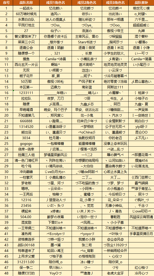 现对第七届亚洲全民竞技赛48强战队提交的替补名单进行公示