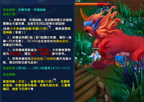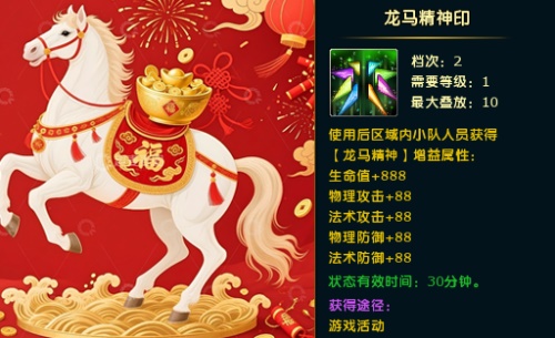 活动详情:入驻《龙武》2月6日新区【驰骋迎岁VS骁腾贺春】,活动期间每日活跃度达100,可免费领取1份【龙马精神印】。使用【龙马精神印】可以为全体队员增加增益属性:生命+888、攻击力+88、防御力+88!