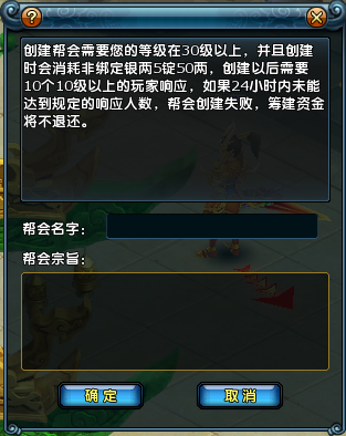 2、输入帮会名字,可以选择输入帮会宗旨,再点击确定,如果帮会名字没有重名,则申请创建成功;