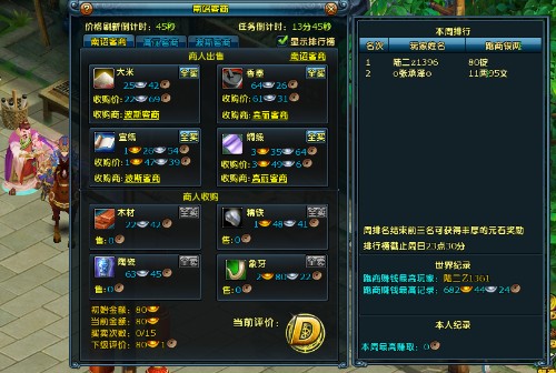 6、跑商买卖过程中有一定的概率获得张继卡和降价卡,可使某商品的价格上涨或者下跌,持续30秒,该段时间内该商品无法再次改变价格;