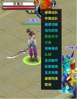 1、左键点击玩家选中玩家,在右键下拉菜单中选择“邀请组队”或者“申请组队”,对方同意后,组队完成。