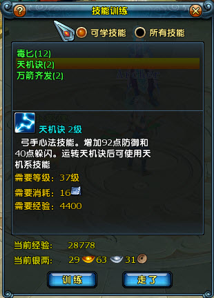 升级技能需要消耗一定的经验和银两,并且有等级限制。当角色有可升级的技能或者新领悟的技能时,在技能界面中该项技能图标的右下角将会出现一个图标闪烁,以提醒玩家学习技能。