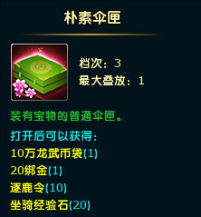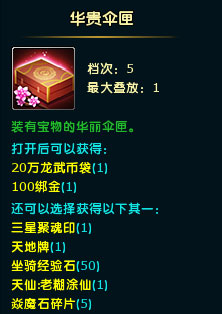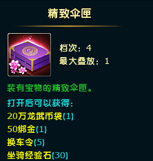 6、【朴素、精致、华贵伞匣】领取后可在游戏内开启,开启后有机会获得丰富的绑金、天地牌、三星聚魂印等超值豪礼!