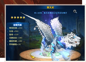 真实战力达35000,每个账号且角色仅限领取一只坐骑:翼天虎(30天)。