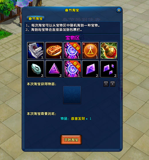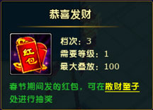 - 活动内容活动期间,玩家击杀副本秦陵探宝、太乙幽魂阵、长白山、瓦岗寨、龙王殿、江都城的所有BOSS,均有机会获得淘宝道具“恭喜发财”。