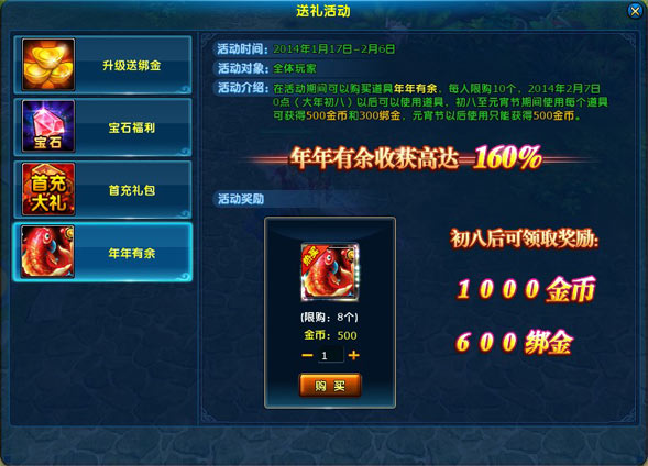 2月7日-2月14日期间,玩家右键点击使用道具“年年有余”,即可获得金币和返利绑金;物品名称 购买价格 产生价值 限购数量 年年有余 500金币 500金币+300绑金 每个角色