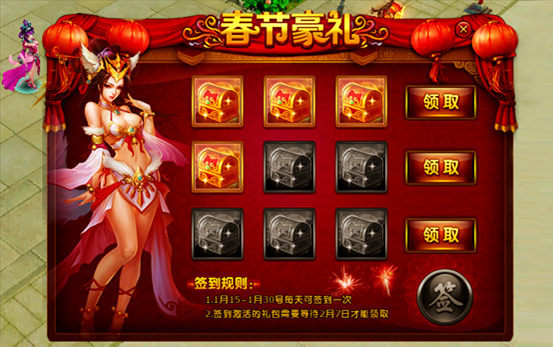- 活动规则1月15日6:00--2月6日23:59期间,玩家可在长安城NPC“春节签到使者”(27,25)处参加签到有喜活动。玩家每天可签到1次,成功签到1次增加1个礼包(礼包越往后越好),活动期间最多可签到9次。