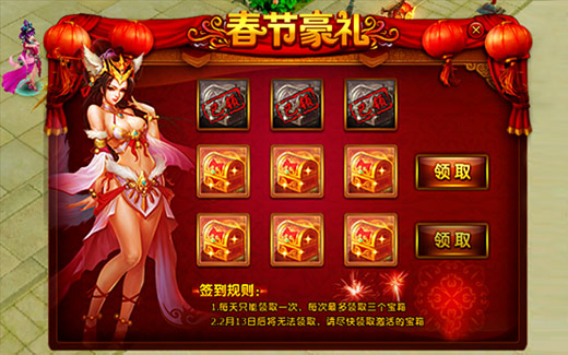 - 领奖方式2月7日6:00--2月13日23:59期间,玩家可在长安城NPC“春节签到使者”(27,25)处领取签到礼包。每天最多可领取1次,每次最多可领取3个签到礼包。活动期间只要3天就可以领取完所有的签到礼包哦!