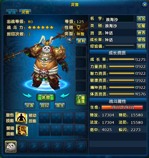 - 神兽属性神兽“浪淘沙”是满培养、满修炼、超高成长率的灵兽,具体属性如图: