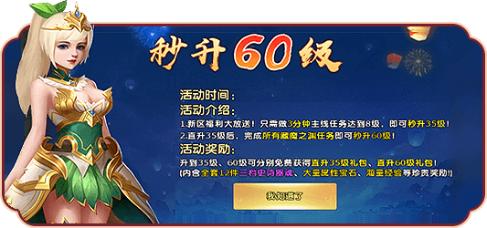 活动内容: 等级直升再进一步,本次新区无论新老玩家只要入驻新服,即可快速等级直升达到60级,并可领取全套装备以及相应的坐骑等福利!大幅缩短升级时间,领先别人一步称霸龙武!