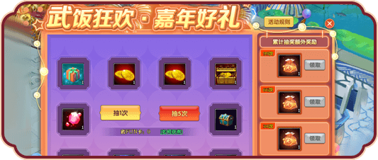 活动内容: 第六届武饭嘉年华盛大开启中!活动期间,玩家可由精英副本、秦陵探宝、太乙幽魂阵、侠客行、卧佛寺、在线活动、网页活动等途径获得武FUN卡,使用武FUN卡可以打开【武饭狂欢●嘉年好礼】抽奖界面抽取各式稀有道具!